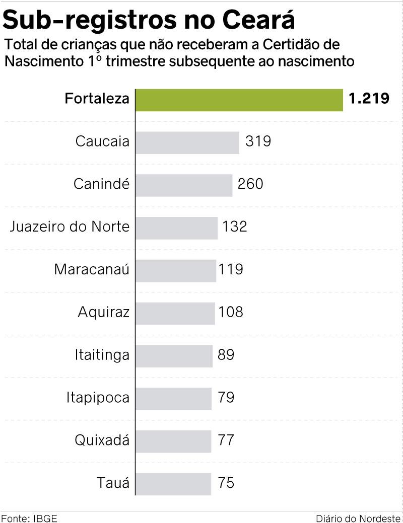 O direito fundamental de ser cidadão perante a Lei ainda é considerado um sonho em municípios do interior do Estado. Os dados mais recentes do Instituto Brasileiro de Geografia e Estatística (IBGE) identificaram 4.746 sub-registros no Ceará, isto é, quando a Certidão de Nascimento não é feita no próprio ano ou no 1º trimestre do ano subsequente ao nascimento. Porém, o número pode ser ainda maior. A realidade é ainda mais dura em municípios do Interior, que não contam com a estrutura necessária para realizar os registros no tempo certo.